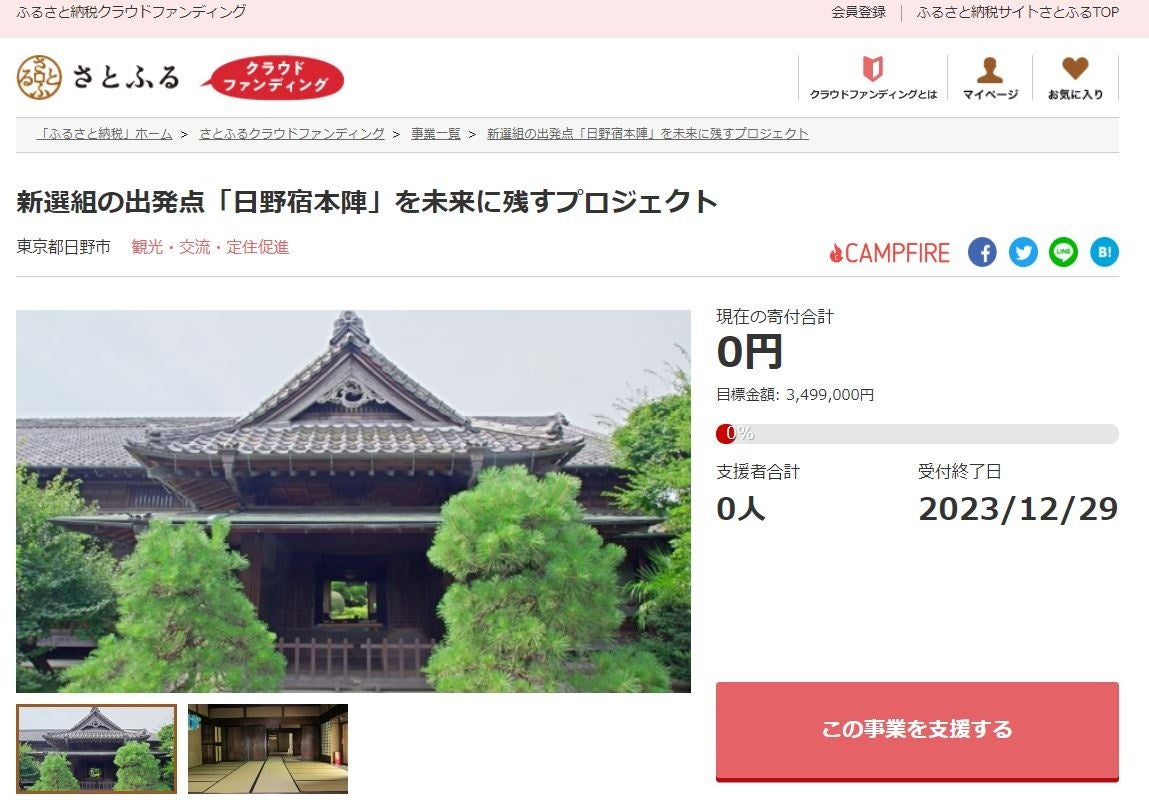 東京都日野市(市長:大坪 冬彦)とふるさと納税ポータルサイト「さとふる」(https://www.satofull.jp/)を運営する株式会社さとふる(本社:東京都中央区、代表取締役社長:藤井 宏明)は、寄付金の使途に応じて事業を立ち上げ寄付を募る「さとふるクラウドファンディング」(https://www.satofull.jp/projects/top.php)にて、日野市指定有形文化財に指定されている貴重な歴史遺産「日野宿本陣」を未来へ残すため、2023年4月3日より寄付受け付けを開始します。
