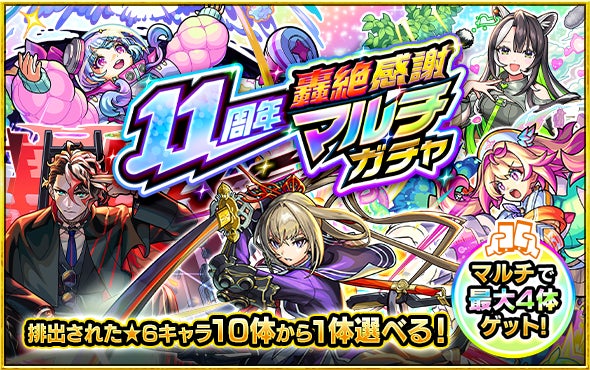最大4人のマルチで引ける★6確定の無料ガチャ「11周年轟絶感謝マルチガチャ」を開催します。11周年轟絶感謝マルチガチャは14種類のガチャから1つ選択し、排出された★6キャラクター「10体」から1体を選ぶことができます。「マルチでガチャる」で一緒に引いた場合、各メンバーが引いた「10体」の候補の中からも、1体ずつ選べます。