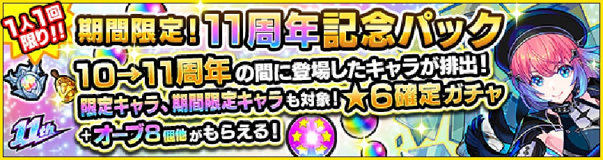 モンスト11周年を記念して、「期間限定!11周年記念パック」が登場します。「期間限定!11周年記念パック」は、限定キャラクター、期間限定キャラクターも排出対象の★6キャラクターが1体確定で入手できる「★6確定ガチャ」が1回引けます。排出対象の★6キャラクターは、10周年~11周年の間に登場したキャラクターで、さらに「オーブ」「エラベルベル」「獣竜玉」などがついてくるお得なパックです。※モンストWebショップ(https://webshop.monster-strike.com/)でも購入できます。