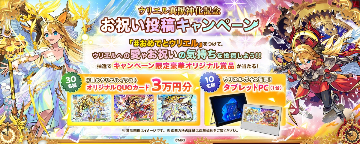 ウリエル真獣神化を記念して、ウリエル真獣神化へのお祝いの気持ちをXに投稿すると参加できるキャンペーンを開催。抽選で「オリジナルQUOカード」や「ウリエルボイス搭載!タブレットPC」が当たります。