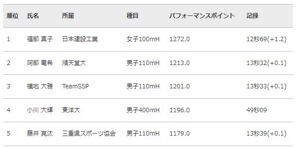 また、1大会のパフォーマンスポイントの合計でグランプリシリーズを通して最も高いパフォーマンスを競う"パフォーマンスランキング"では、2024オールスターナイト陸上で日本記録を更新した女子100mハードル・福部真子が1位に躍り出ました。