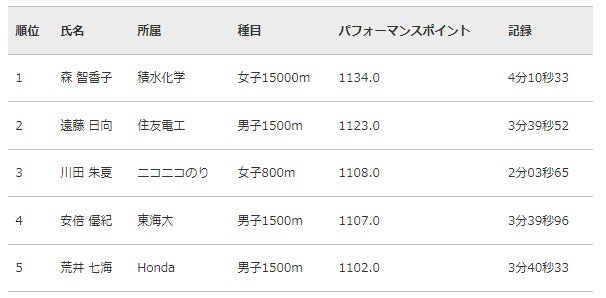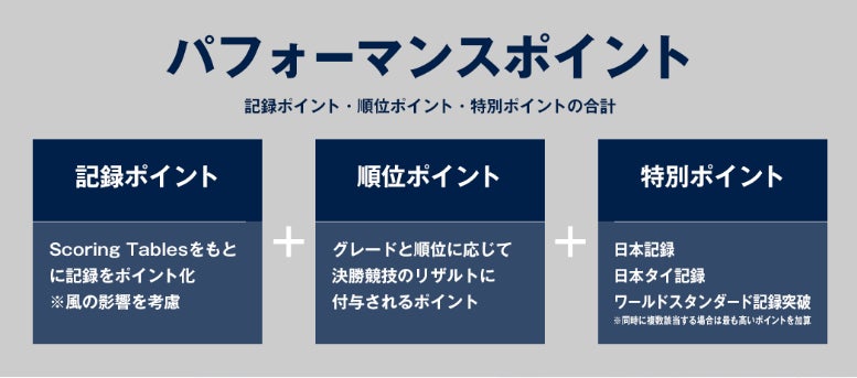 ※「パフォーマンスポイント」は、「記録ポイント」(Scoring Tablesをもとに記録をポイント化したもの)と、「順位ポイント」、「特別ポイント」(日本記録、日本タイ記録、ワールドスタンダード記録を突破した際に付与するもの)を合計したポイントのことを言います。