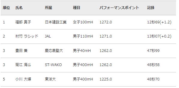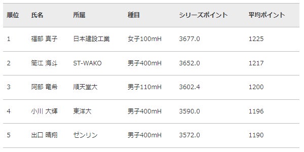 上位3大会のパフォーマンスポイントの合計で「種目を超えて」年間を通して競う"シリーズランキング"でトップに躍り出たのは男子:筒江海斗(ST-WAKO)、女子:福部真子(日本建設工業)のハードル陣!