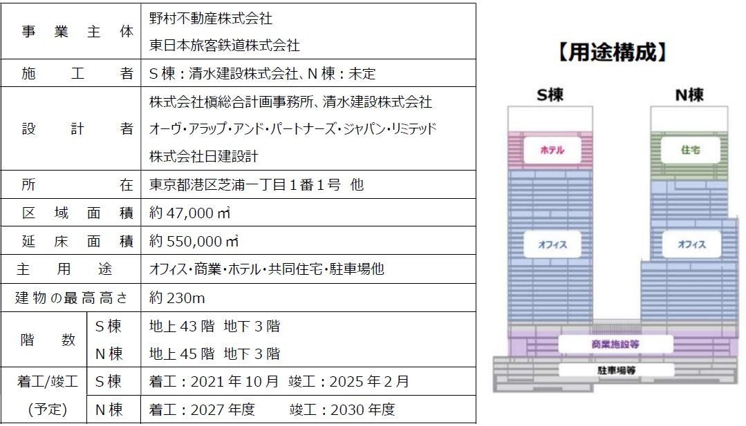 本プロジェクトは、浜松町ビルディング(東芝ビルディング:東京都港区芝浦1-1-1)の建替事業として、2021年10月に着工したS棟と、2027年度着工予定のN棟からなるツインタワーの建設を計画しております。(竣工予定時期:S棟2025年2月、全体2030年度)区域面積約4.7ha、延床面積約55万㎡の、オフィス・ホテル・商業施設・住宅等を含む、約10年間に及ぶ大規模複合再開発です。東京ベイエリアの新たなシンボルとして、国際ビジネス・観光拠点を創出します。本プロジェクトでは、街づくりを通じて、人も社会も、現在も未来も、継続して健やかで幸せであることを目指します。