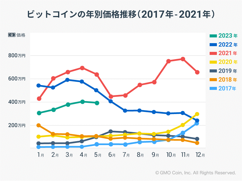 暗号資産取引のGMOコイン:ビットコイン(BTC)の年別価格推移