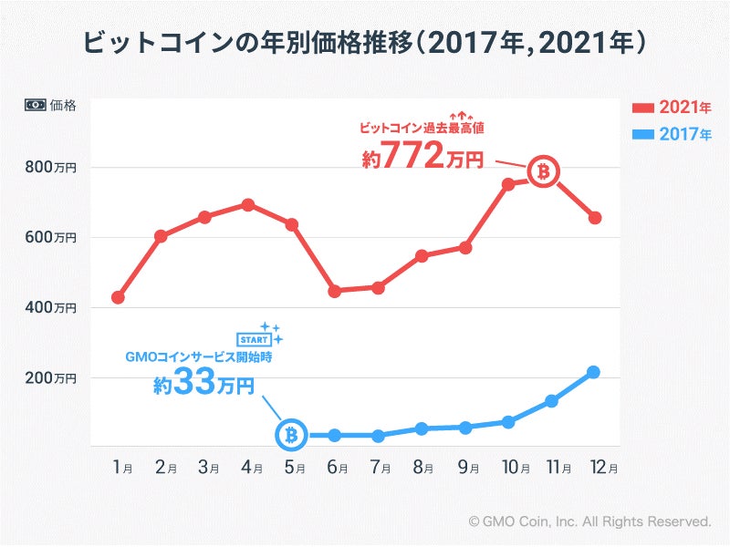 2017年は「仮想通貨元年」ともいわれ、国内でも法整備が進むなど、暗号資産そのものの存在が広く認知され、市場に多くの資金が集まりました。その結果、5月のGMOコインサービス開始時には約33万円だったビットコイン(BTC)の価格は、12月には約7倍となる約233万円を記録しました。