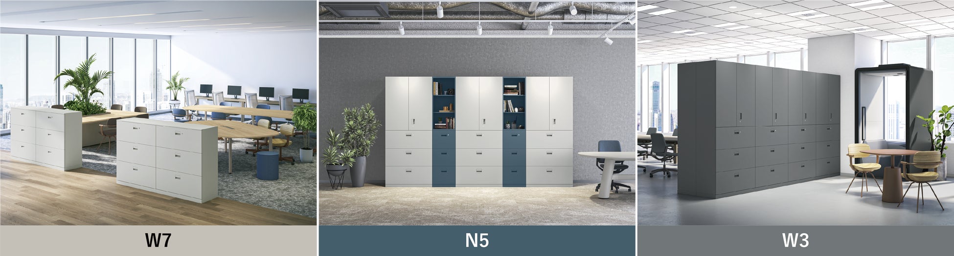 執務エリアの収納については、エスキャビネットにカラーを追加します。メインカラーW7(サテンホワイトグレーW)色を追加するほか、アクセントカラーとしてN5(サテンティールブルー)、壁面になじむ低明度カラーとしてW3(ダークグレーW)を追加。全面サテン調の仕上げとなっています。