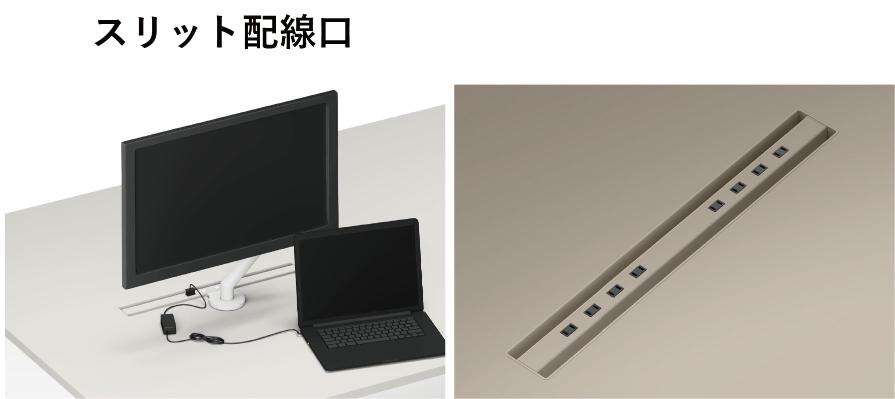 ワークテーブルにはスリット配線口タイプも追加します。横長の細長い形状の配線スリットは、机上面を広く使うことが可能で、モニターを自由な位置にクランプ出来る形状となっており、個人執務をより快適に行うことができます。