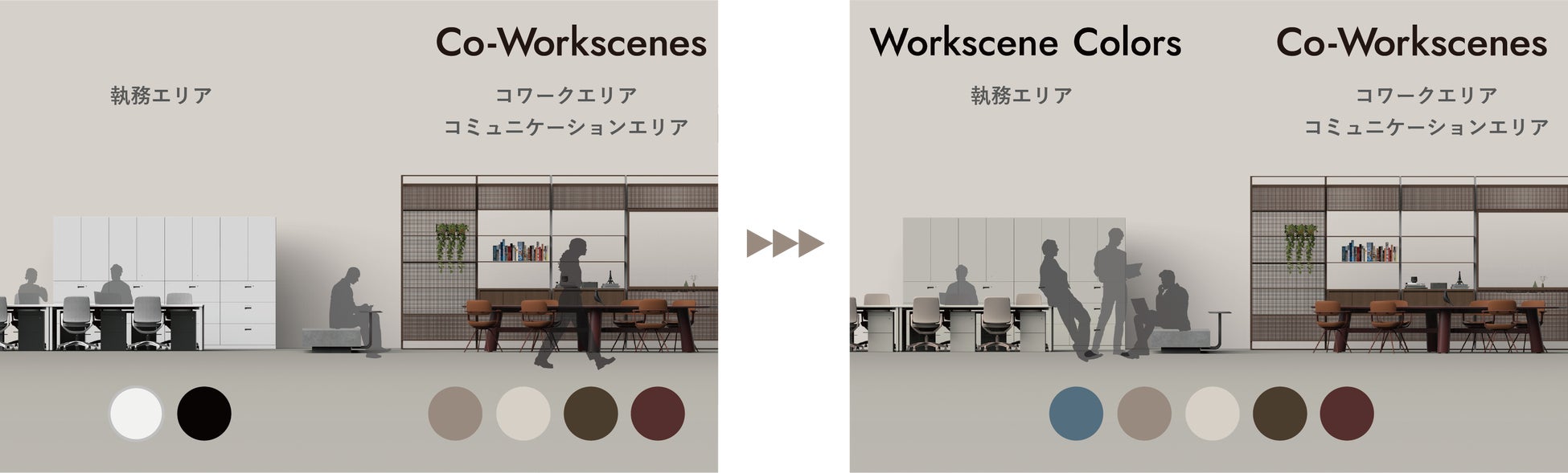 Co-Workscenesが「自然なコミュニケーションや一体感を生む居場所」を支えるのに対し、Workscene Colorsは「働く中心となる場」の質を高め、空間全体を自然につなぐことを目的としています。