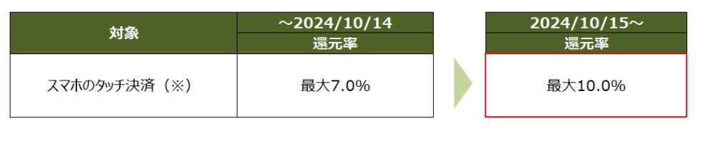 10月15日(火)の店頭ご利用分から、三井住友カードのスマホのタッチ決済で最大10%還元となります。