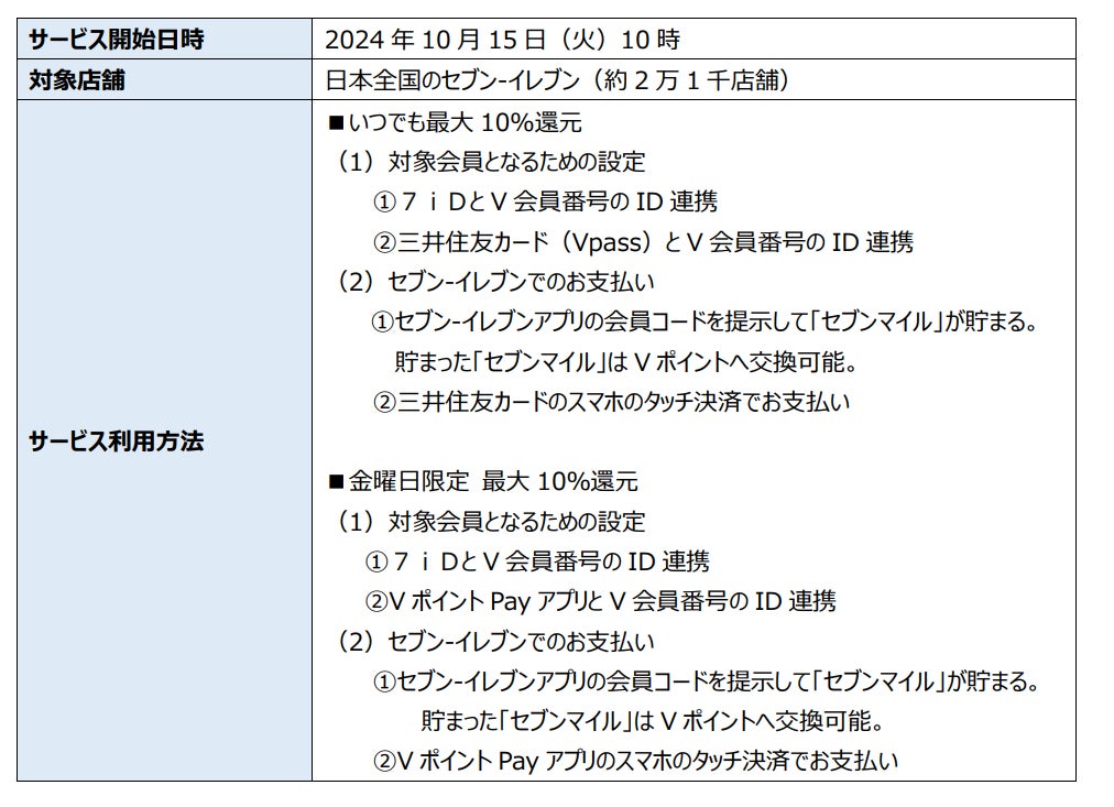 これまで、三井住友カードが実施する「対象のコンビニ・飲食店で最大7%ポイント還元」施策において、セブン-イレブンで三井住友カードのスマホのタッチ決済をご利用いただいた場合、通常ポイントを含む最大7%のVポイントを還元しておりましたが、2024年10月15日(火)より、セブン-イレブンでのVポイントサービスがレベルアップしております。