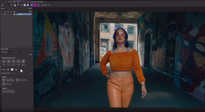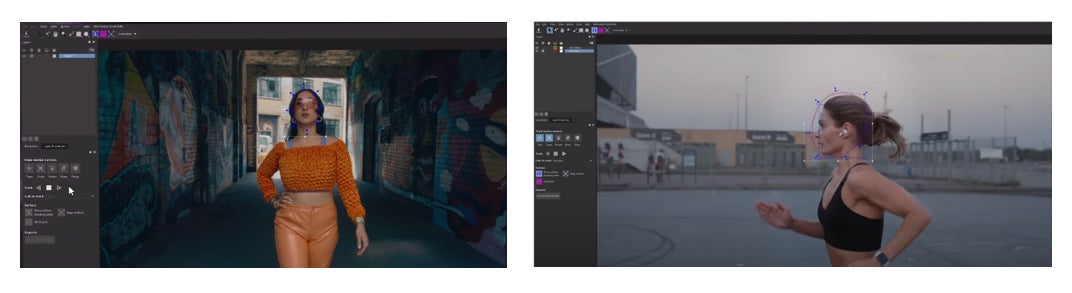 Mocha のフラット・トラッキング・テクノロジーにより、映像内のオブジェクトが移動したり視点が変わったりしても、それらを正確に追跡できます。 ディスプレイに映像をはめ込み合成したり、顔や服にCGを合成したりできます。 | Mocha のトラッキングは、揺れた映像を安定させたり、安定化効果を適用したりするのに役立ちます。 |
