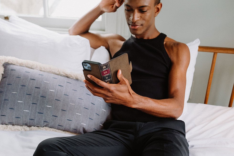 MagSafe充電器対応のiPhone15シリーズ用フルグレイン本革レザーケース、ヴィンテージ洋書風ハードカバーはリアル財布機能搭載、そして折りたたみ式ディスプレイスタンドに変形。ブラウン、ブラックの2色展開。