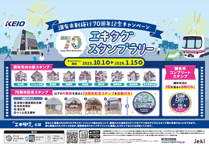 ◎2025年10月1日(水)より、「調布市制施行70周年記念キャンペーン エキタグスタンプラリー」を開催します。スタンプラリー期間中に、対象の施設や対象駅でエキタグを取得するとオリジナルスタンプをプレゼント!ぜひこの機会に、鉄道の旅をお楽しみください!