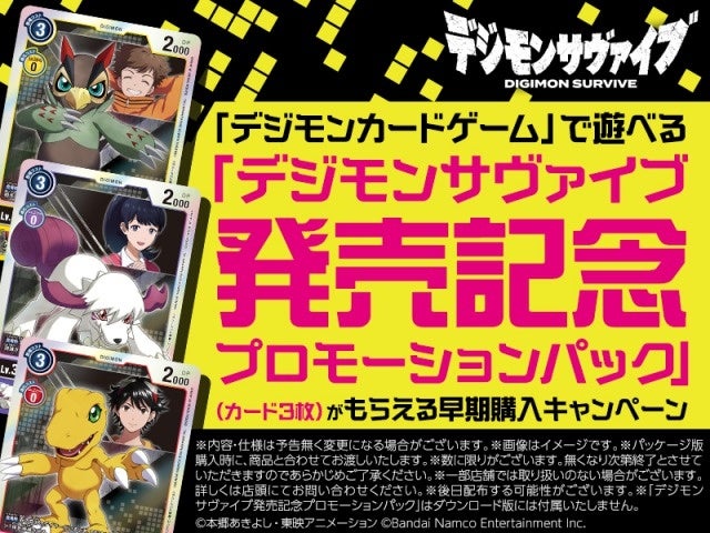 また、パッケージ版を購入すると「デジモンカードゲーム」で遊べる「デジモンサヴァイブ発売記念プロモーションパック」(カード3枚)がもらえる早期購入キャンペーンも実施中!