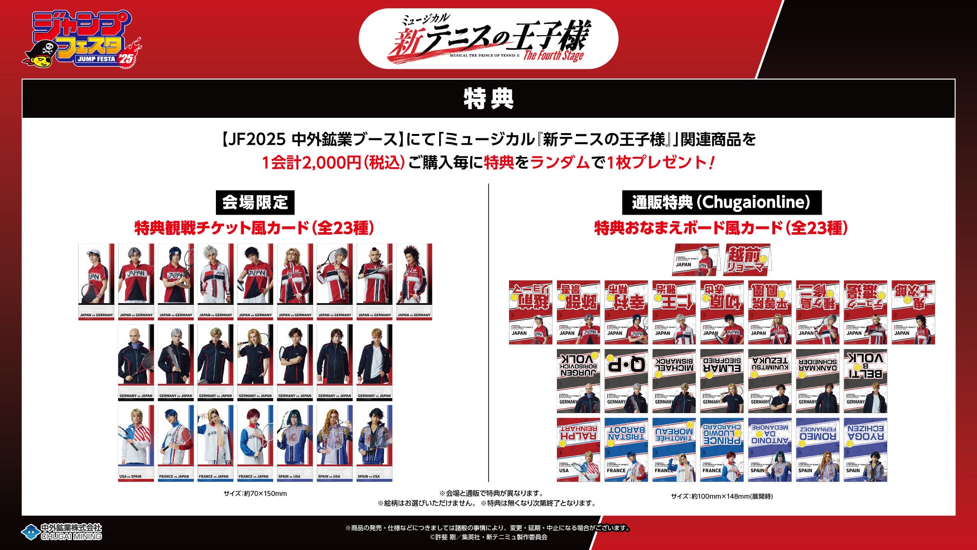 中外鉱業ブースにて「ミュージカル『新テニスの王子様』 The Fourth Stage」JF2025関連商品を1会計2,000円(税込)ご購入毎に、観戦チケット風カード(全23種)をランダムで1枚プレゼントします。