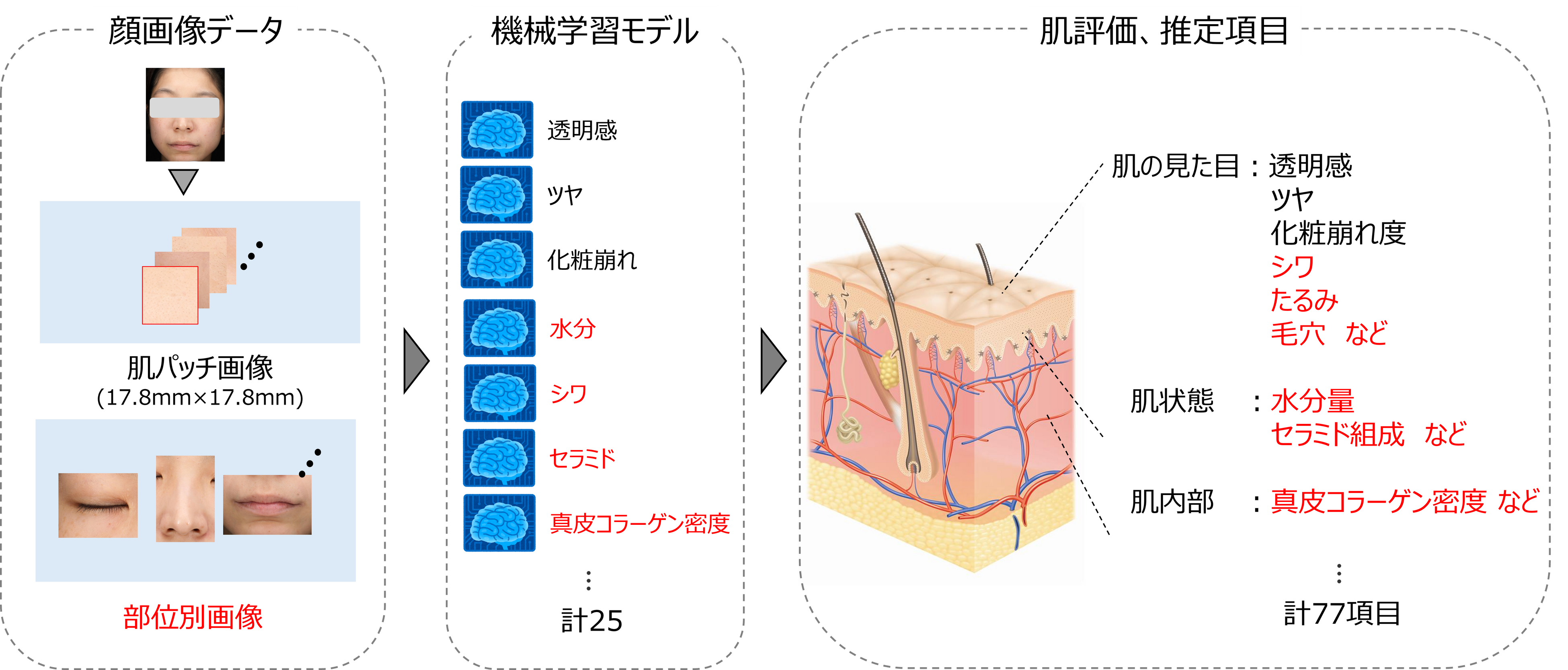 これにより、「Kirei肌AI」には計25の機械学習モデルが搭載され、肌表面の見た目から内部まで77項目にも及ぶ肌状態を評価、推定できるようになりました(図1)。