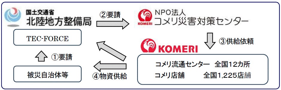 ・コメリグループの店舗網、物流網を通じ、北陸地方整備局から広域派遣される