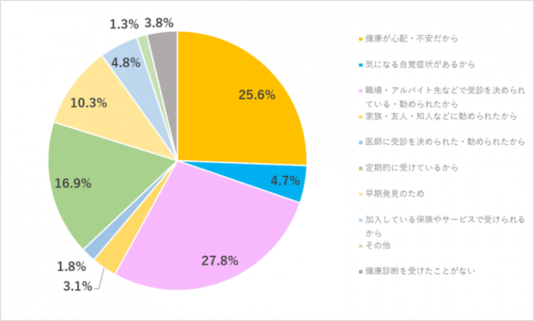健康診断を受ける理由は何かという質問に対して、「職場・アルバイト先などで受診を決められている・勧められたから」と回答した方が27.8%で最も多くなりました。次いで、「健康が心配・不安だから」と回答した方が25.6%、「定期的に受けているから」と回答した方が16.9%でした。