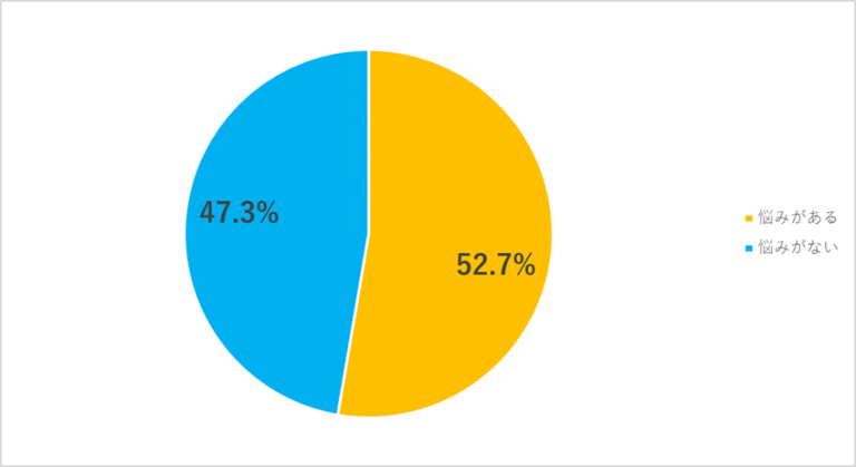 現在、健康についての悩みはあるかという質問に対して、「悩みがある」と回答した方が52.7%で、多くの方が健康について悩みがあるという回答になりました。