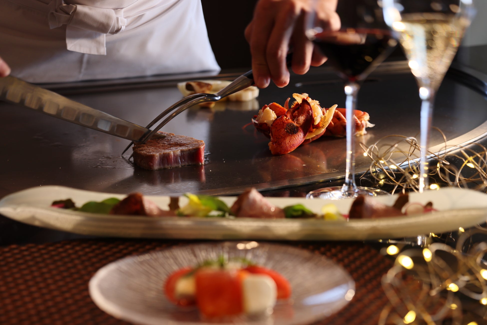 目の前のカウンターで焼き上げるライブ感が非日常感を演出する「鉄板焼 おおみ」。クリスマス特別コースの『聖夜』は、[近江牛ローストビーフサラダ]、[蕪の蟹身餡かけ]などに、メインは[オマール海老と蝦夷鮑]&[近江牛フィレ肉]をダブルでお楽しみいただけます。聖なる夜のはじまりを祝う乾杯用のシャンパン(またはノンアルコールスパークリングワイン)が付いたスペシャルコースです。