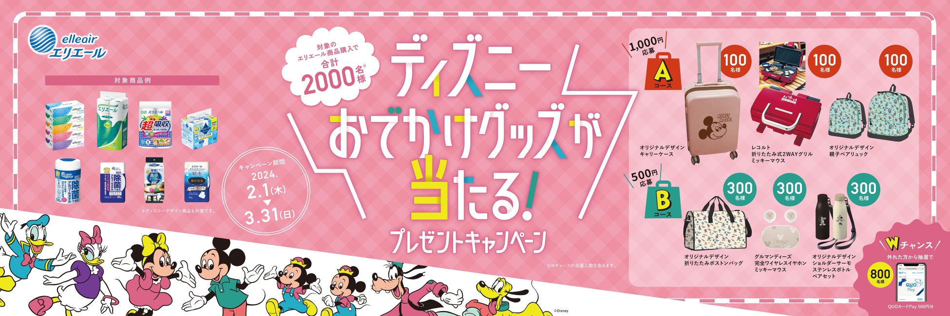 お子さまから大人まで世代を超えて愛されるディズニーデザイングッズが当たる本キャンペーンでは、ティシューやトイレットペーパー、ウエットティシューなど対象のエリエール商品を購入したレシートで応募いただくと、全6種のおでかけグッズを抽選で1,200名さまにプレゼント。ここでしか手に入らないオリジナルデザインのキャリーケースや親子ペアリュック、ボストンバッグ、ステンレスボトルのほか、折りたたみ式の2WAYグリルやミッキーマウスが描かれたワイヤレスイヤホンなど、春のおでかけシーンを楽しく彩るグッズを揃えました。外れた方にも合計800名さまに「QUOカードPay」500円分が当たるWチャンスを併せて実施します。