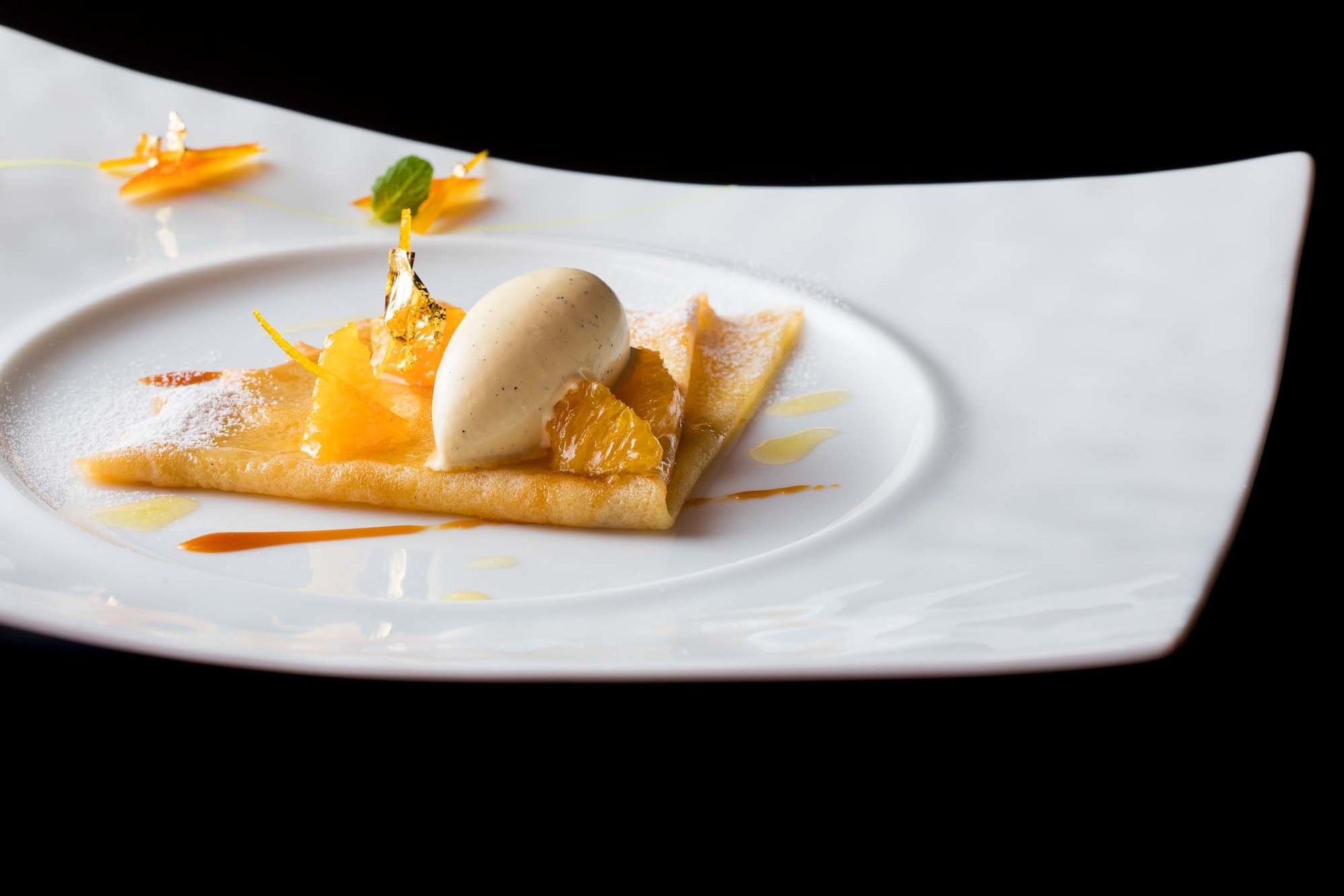 商品詳細:薄く手焼きをしたクレープをバターやオレンジ果汁などのソースと共に火にかけ、トリプルセックでフランベして仕上げた一皿。タヒチ産バニラアイスと共にお召し上がりください。