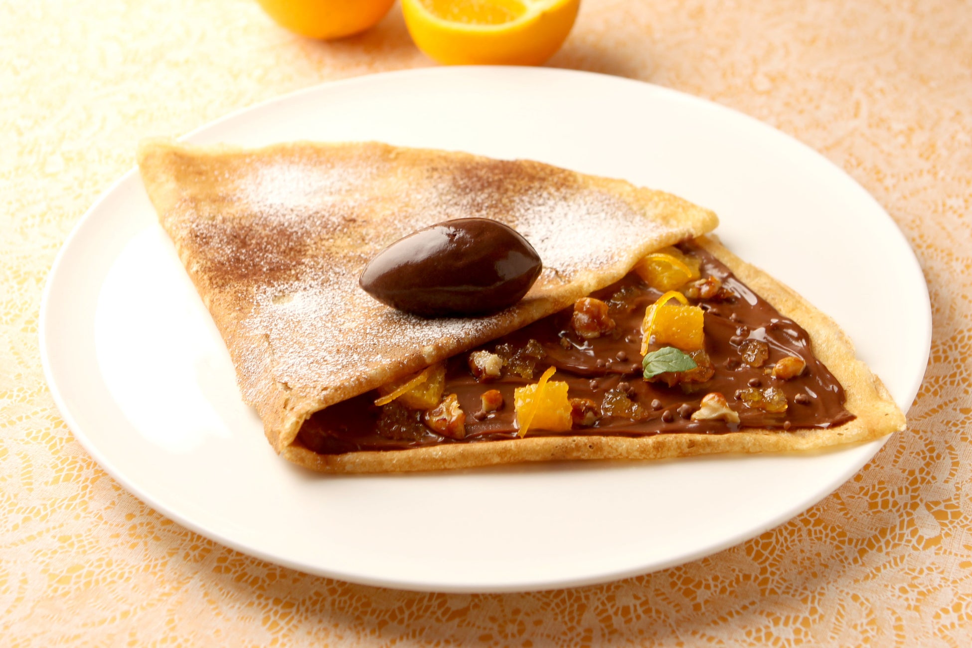 商品詳細:卵、牛乳、小麦粉を主材料として、バターの香りを残したクレープ生地に、ヘーゼルナッツが香るチョコレートのクリーム、オレンジを合わせた一皿です。