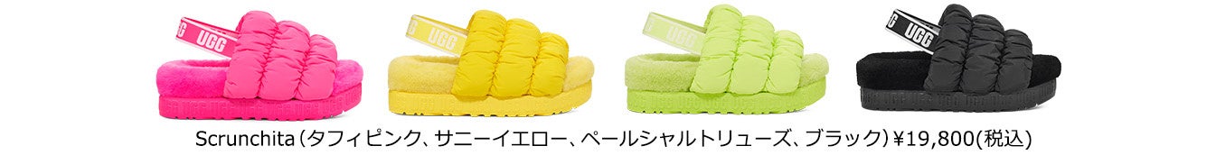 UGG春夏の新作サンダルは他にも沢山!ふわもこのFluff Yeah Slide(フラッフ イヤー スライド)サンダルにインスピレーションを得て、ふっくらとしたキルテッド素材をくしゅっとさせたアッパーでアップデートしたScrunchita(スクランチータ)は、Fluffita(フラッフィータ)サンダルと同じストリート仕様のソールでUGGグラフィックロゴのディテールが足元にアクセントを加えてくれる一足。