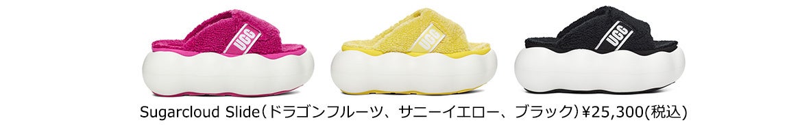 Fluff Sugar(フラッフ シュガー)サンダルを足掛かりに、サステナビリティのためのイノベーションと、UGGならではのエフォートレスなスタイルや心地よさを組み合わせて誕生した新スタイルSugarcloud Slide(シュガークラウド スライド)も本日発売開始。白い雲の上を歩いているようなアイコニックなデザインで、UGGのシグネチャーであるフラッフを植物由来のTENCEL™リヨセル と再生ポリエステルをブレンドした素材でアップデート。再生可能なサトウキビでつくられたEVAのミッドソールと、再生ラバー50%を使用したモールドラバーのアウトソール、UGGロゴ織りラベルもTENCEL™ リヨセル100%使用など、細かい部分まで環境に配慮したサステナブルなサンダルです。