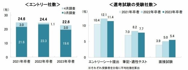 ○一人あたりのエントリー社数の平均は22.6社。前年同期調査(24.4社)を約2社下回りました