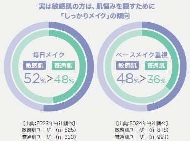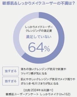一方、敏感肌の方はナチュラルメイクが多いと思われがちですが、当社の調査によると、実は、肌の悩みをカバーするためにベースメイクを重視し、毎日「しっかりメイク」している傾向にあります。また、敏感肌でしっかりメイクしている方の60%以上が、「落ちの強いクレンジングだと肌への刺激やツッパリ感が気になる」、「肌にマイルドなクレンジングだとメイクや毛穴汚れの残りが気になる」など、自分に合う商品に出会えていない不満を持っていることも分かりました。