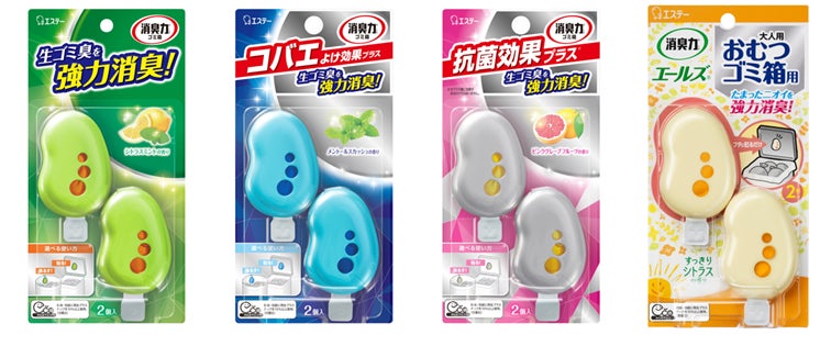 ラインナップは、すっきり消臭する「消臭力 ゴミ箱用」〈シトラスミントの香り〉、コバエを寄せ付けない忌避成分(※4)配合の「消臭力 ゴミ箱用 コバエよけ効果プラス」〈メントールスカッシュの香り〉、生ゴミ臭の原因菌の増殖を抑える抗菌成分(※4)(※5)配合の「消臭力 ゴミ箱用 抗菌効果プラス」〈ピンクグレープフルーツの香り〉、使用済みの大人用おむつや尿取りパッドを捨てるゴミ箱から漏れるニオイを消臭する、介護専用の「消臭力 エールズ おむつゴミ箱用」です。