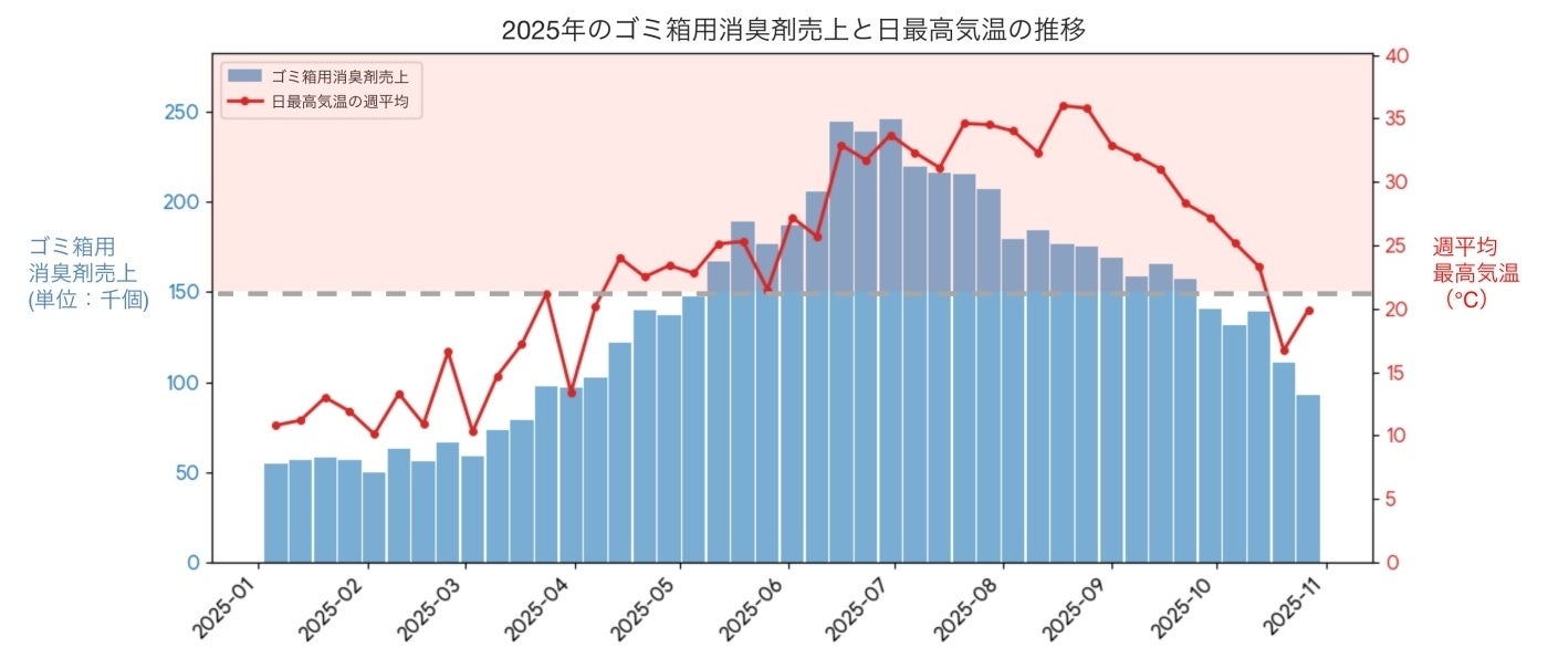 さまざまな気象情報を取り扱う株式会社ウェザーニューズ協力のもと、2025年におけるゴミ箱用消臭芳香剤の売上と気温の相関関係を分析したところ、気温の上昇に伴い販売数も増加していることがわかりました。とくに、生活者が「暑くなってきたな」と体感する、日中の最高気温が21℃から27℃で販売数が加速する傾向に。