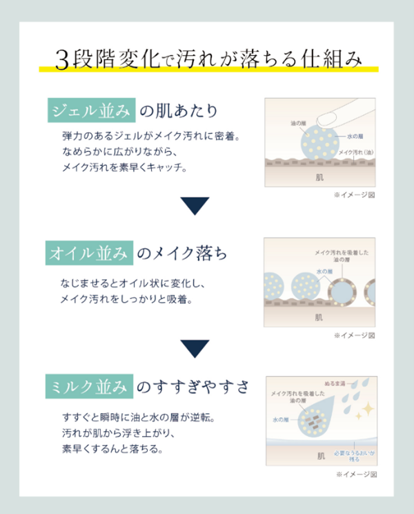 「ジェルの肌あたり」「オイルのクレンジング力」「ミルクのすすぎの速さ」の3つの機能を持ち合わせ、「肌へのやさしさ」「メイク落ちの早さ」を同時に実現します。