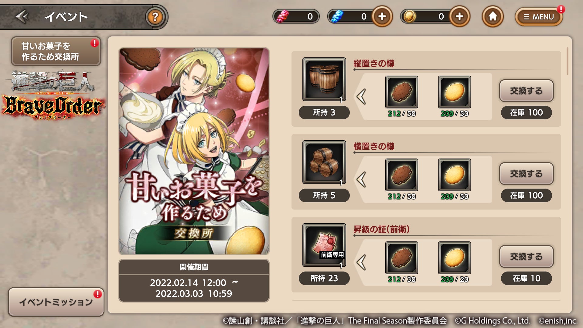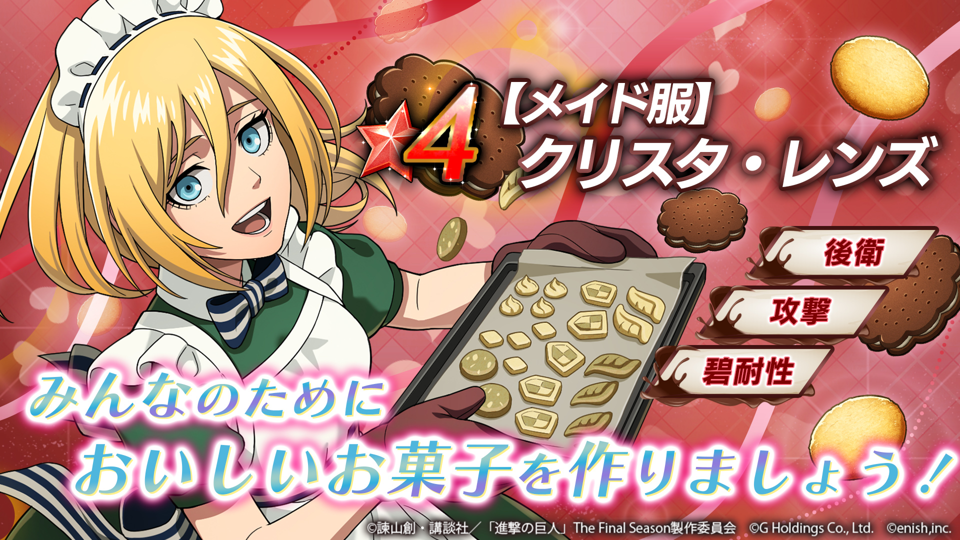 株式会社enish(本社:東京都港区、代表取締役社長:安徳 孝平、以下enish)は、2022年2月11日に配信を開始したアニメ『進撃の巨人』のスマートフォンゲーム最新作「進撃の巨人Brave Order」にて、初のイベントとなる「甘いお菓子を作るため」を開催いたします。当イベントではオリジナルストーリーにちなんだイベント限定巨人の討伐が可能となっております。またイベント限定衣装に身を纏ったアニ・レオンハートとクリスタ・レンズが登場いたします。最新情報は、ゲーム公式サイト・ゲーム公式Twitterアカウントにて随時公開して行きますので、ぜひご覧ください。