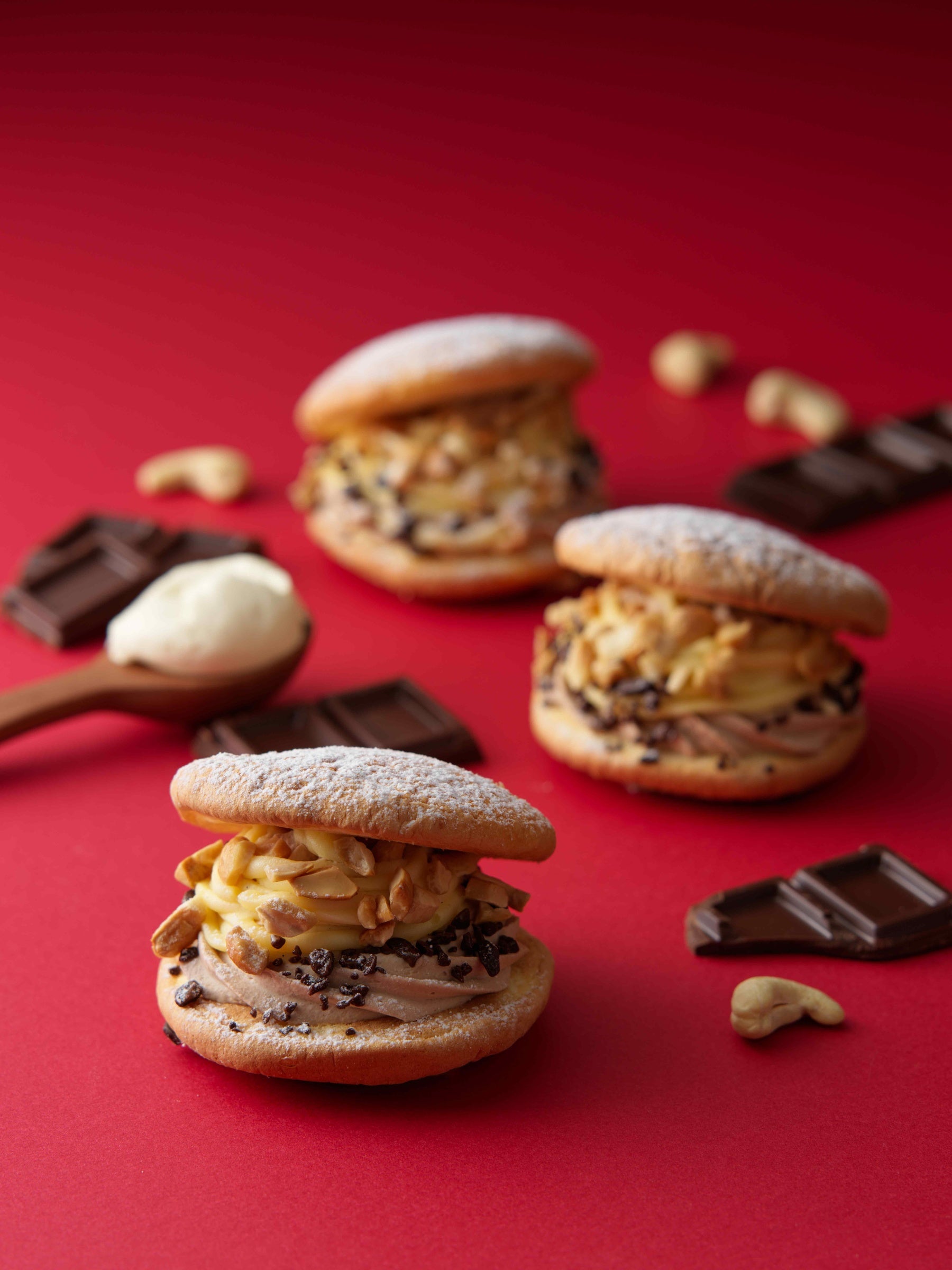 しっとり、ふんわりの生ブッセ生地にクリームチーズとヘーゼルナッツペーストで仕上げた“ショコラヘーゼルチーズクリーム”を絞り、更にカスタードクリームとカシューナッツ、チョコチップをトッピングし華やかに仕上げました。