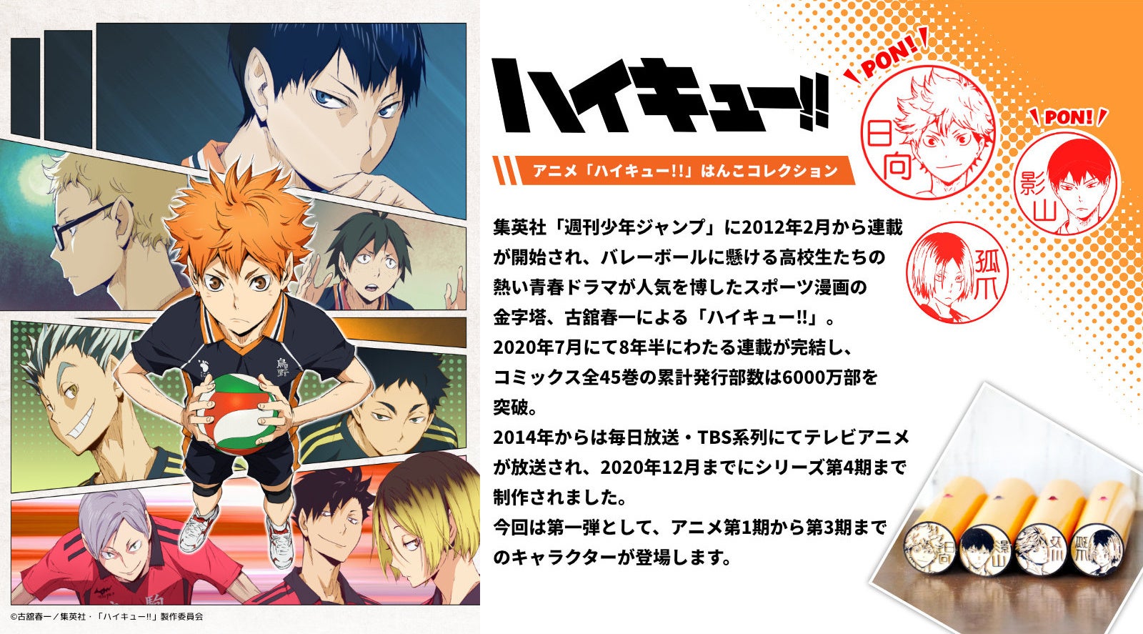 銀行登録OK!?日向、影山、月島、及川、孤爪など、アニメ「ハイキュー!!」に登場するキャラクターが選べるオーダーメイドはんこ「アニメ『ハイキュー!!』はんこコレクション」の発売スタート。