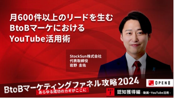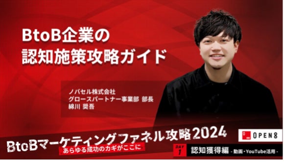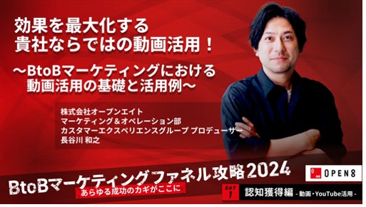 株式会社イノベーション(東証グロース 証券コード3970)のグループ会社である、株式会社Innovation & Co(本社:東京都渋谷区、代表取締役社長:齊藤和馬、以下「Innovation & Co」)は、株式会社オープンエイト(本社:東京都千代田区、代表取締役社長兼CEO:髙松雄康、以下オープンエイト)と共催で、2024年10月8日(火)に、『“あらゆる成功のカギがここに” B to Bマーケティングファネル攻略 Day1「認知獲得における動画/YouTube活用編」』をテーマとしたイベントを開催することをお知らせいたします。