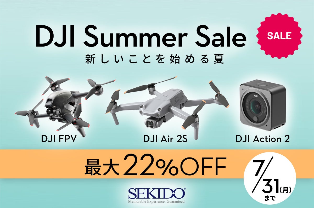 日本初のDJI正規販売代理店である株式会社セキド(本社:東京都港区、代表取締役:大下貴之)では、本格空撮や新感覚のフライトが体験できるドローンや、アクティブな撮影を実現するウェアラブルアクションカムを対象に、最大 22%OFFとなる「DJI Summer Sale」を7月14日(金)より開催いたします。機能と操作性、価格のバランスが良い人気ドローン DJI Air 2S(エアー ツーエス)、没入感溢れるドローン視点でのフライト体験と独創的な空撮が可能な DJI FPV(エフピーブイ)、マグネット式マウントでどこにでも取り付けてアクティブに撮影できるアクションカム DJI Action 2(アクション ツー)の3モデルを対象に、DJI製品でこの夏を盛り上げるビッグセール。レジャーやイベント、夏休みの思い出を高画質撮影で残す絶好のチャンスです。