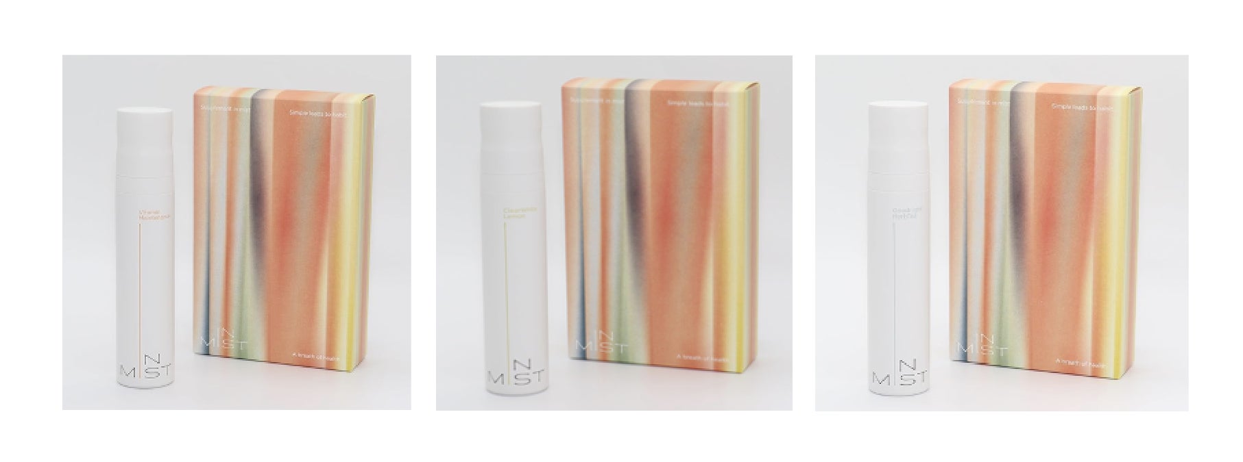 ギフト商品には、オリジナルデザインのギフトボックスが付属。3色のフレーバーが美しく混ざり合う様子をグラフィックとして表現しました。「IN MIST」の成分が身体にポジティブに広がっていく感覚を、視覚でもお楽しみいただけます。