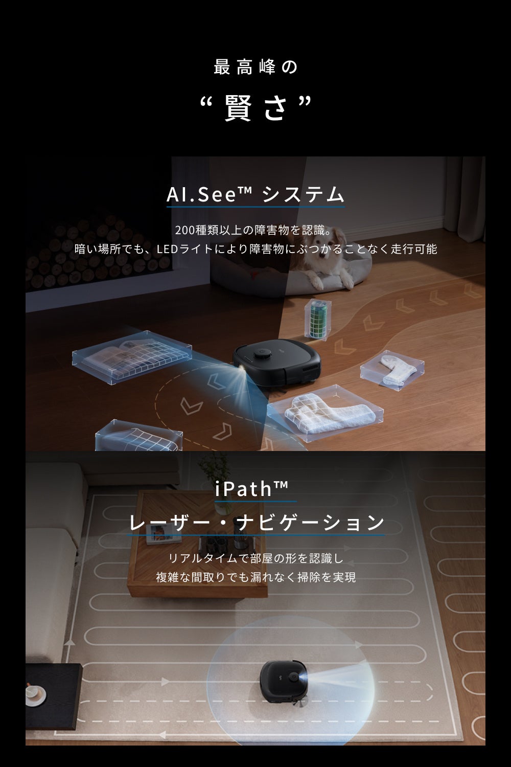 - 高精度な障害物回避とマッピング:AIカメラによる高精度な障害物回避システム「AI.See™システム」を搭載し、おもちゃやスリッパ等の200以上の物体を認識して的確に回避。さらに独自のiPath™ レーザー・ナビゲーションシステムにより、リアルタイムで部屋の形を認識してマップを作成し、複雑な間取りでも漏れなく効率的な経路を作成して掃除します。