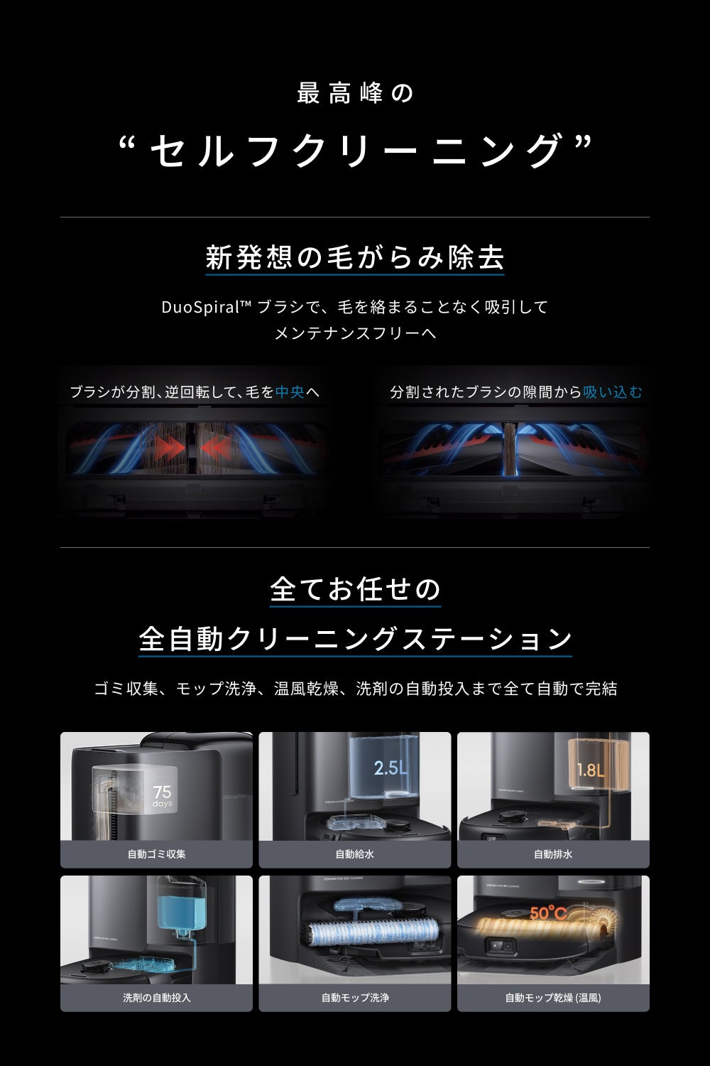 - 全自動セルフクリーニング:ゴミ収集、モップ洗浄、温風乾燥、洗剤の自動投入まで全てを自動で完結するクリーニングステーションにより、日常のお手入れの手間を最小限に抑え、常に清潔な状態を保ちます。
