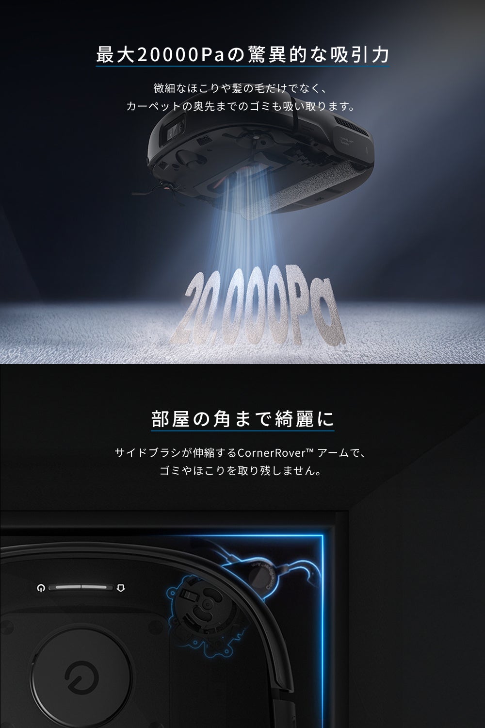 - 驚異的な吸引力:吸引力はEufyのロボット掃除機史上最もパワフルな(※ 2025年8月時点)最大20000Paに進化し、カーペットの奥のほこりまで強力に吸引。部屋の角を検知すると伸びるサイドブラシにより部屋の隅々まで取り残しなく掃除します。