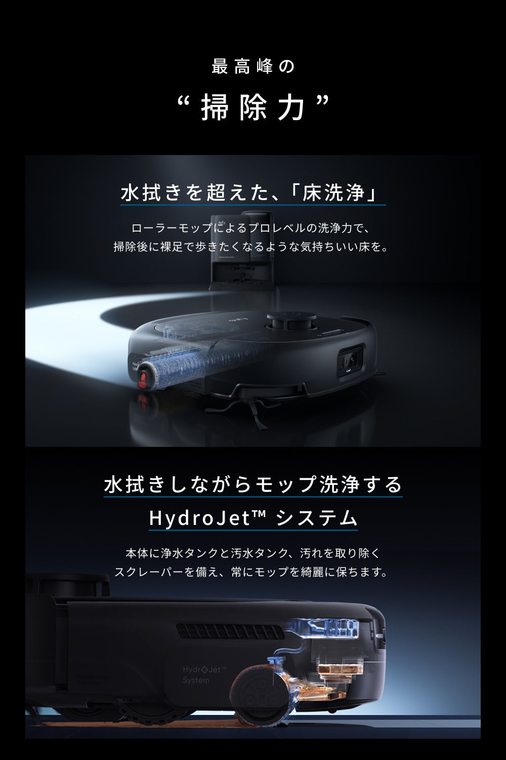 - ローラー型の水拭きモップ:約29cmの幅広のローラーモップを採用し、水拭き中に拭き上げた汚れを引きずることなくロボット掃除機本体内で洗浄する「HydroJet™ システム」を搭載。業界最高レベルの約1.5kgの圧力をかけて床を「押して拭く」ことで、汗や皮脂等のこびりついたしつこい汚れも除去し、水拭きを超えた「床洗浄」を実現します。