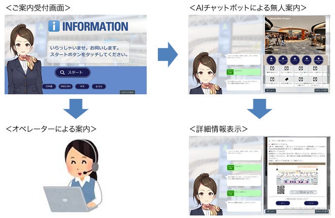 今回の実証実験では、OKIの接客支援ミドルウェア「CounterSmart(注1)」を活用し、AI対話エンジンによる無人案内やオペレーターによるリモート支援を行います。お客様対応の多数を占める施設案内などのお問い合わせについて、AIチャットボットによる自動応対で解決できるようになると、案内スタッフはその他のお問い合わせが必要なお客様に、より注力できるようになることが期待されます。