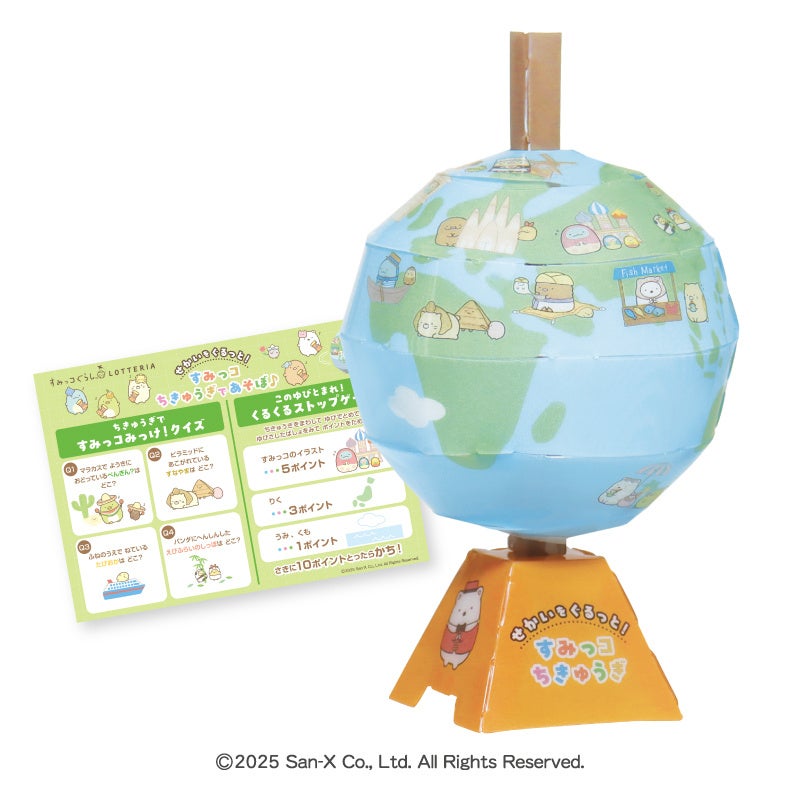 「すみっコぐらしおもちゃ」は、組み立てトランクに折り紙を入れて持ち運べる「おりがみつき!すみっコトランク」、シャッターを押して遊べる組み立てカメラや3つのカード遊びを楽しめる「パシャっと!すみっコかるた」、組み立て地球儀をくるくると回して遊べる「せかいをぐるっと!すみっコちきゅうぎ」の3種類から1種類をお選びいただけます。