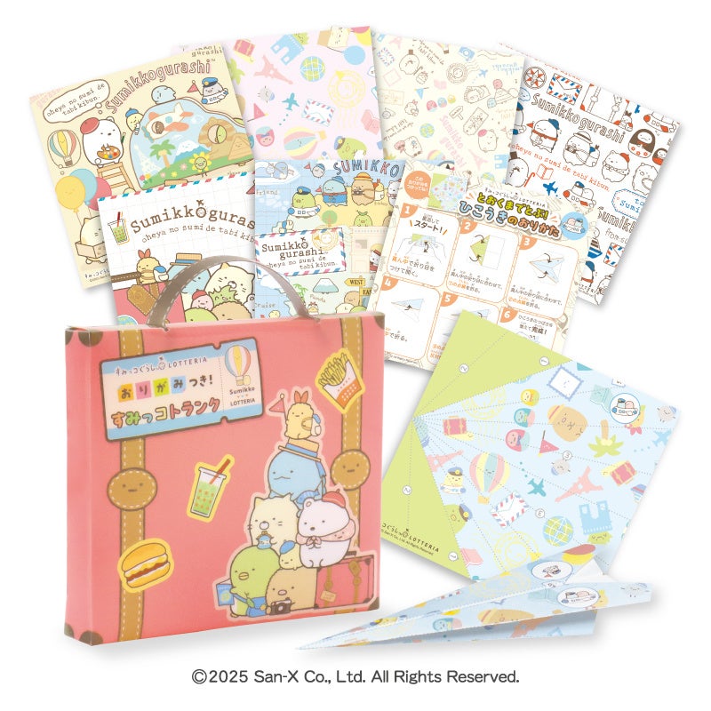 旅行用トランクをモチーフにした組み立て式のケースと、すみっコたちの旅のデザインを楽しめる折り紙のセットです。紙飛行機を作って飛ばしたり、好きな折り紙を自由に折ったりしてお楽しみください。遊び終わったらトランクに片づけることができます。