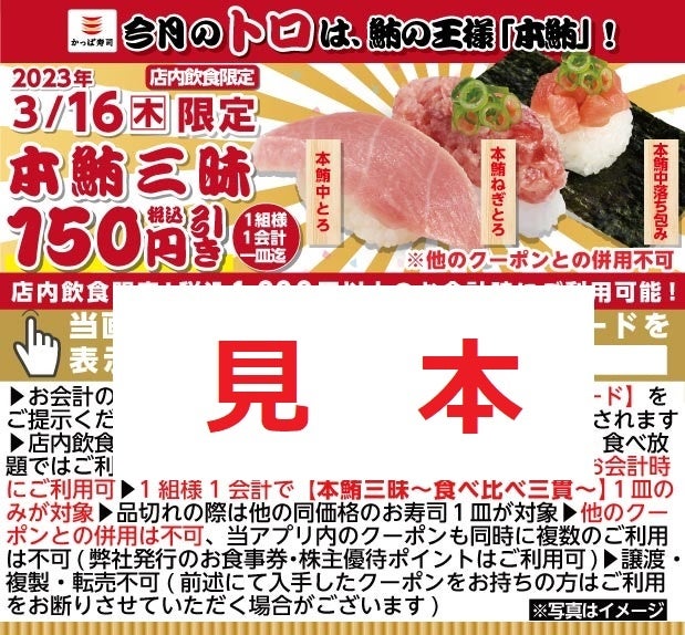 2023年3月15日(水)~3月21日(火・祝)の期間、鮪の王様と呼ばれる本鮪を一皿で堪能できる「本鮪三昧」が店内飲食限定、お値打ち価格にてご提供いたします。さらに、公式アプリ会員限定で、3月16日(木)に「トロ(16)の日」対象クーポンをご提示いただくと、当日限定で店頭販売価格363円(税込)の「本鮪三昧」を150円(税込)引きいたします。
