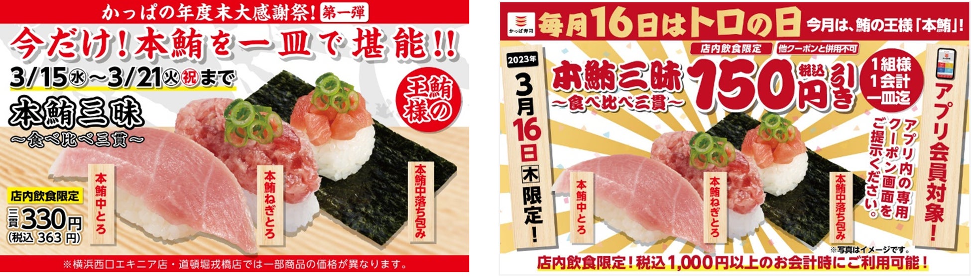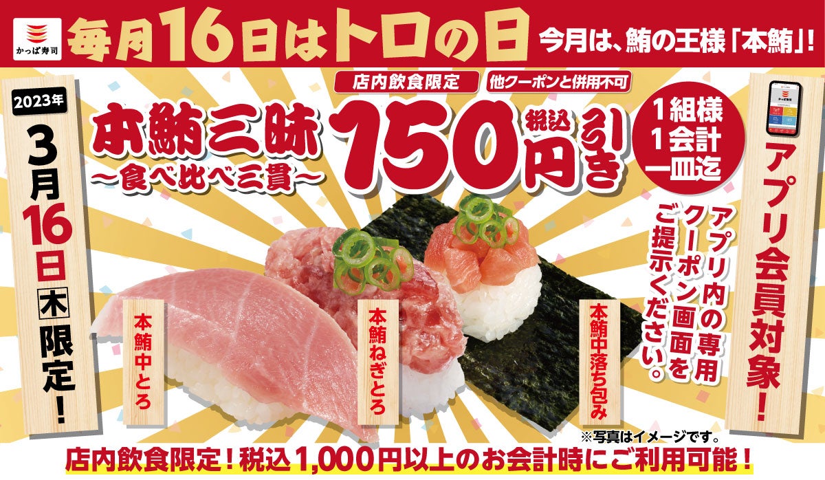 かっぱ寿司公式アプリ会員は、「トロ(16)の日」限定クーポンでさらにお得に『かっぱの年度末大感謝祭』 、第一弾「本鮪三昧」期間限定提供